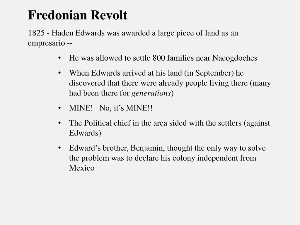 Fredonian Revolt • 1825 - Haden Edwards was awarded a large piece of land as an empresario -- • He was allowed to settle 800 families near Nacogdoches • When Edwards arrived at his land (in September) he discovered that there were already people living there (many had been there for generations) • MINE! No, it’s MINE!! • The Political chief in the area sided with the settlers (against Edwards) • Edward’s brother, Benjamin, thought the only way to solve the problem was to declare his colony independent from Mexico