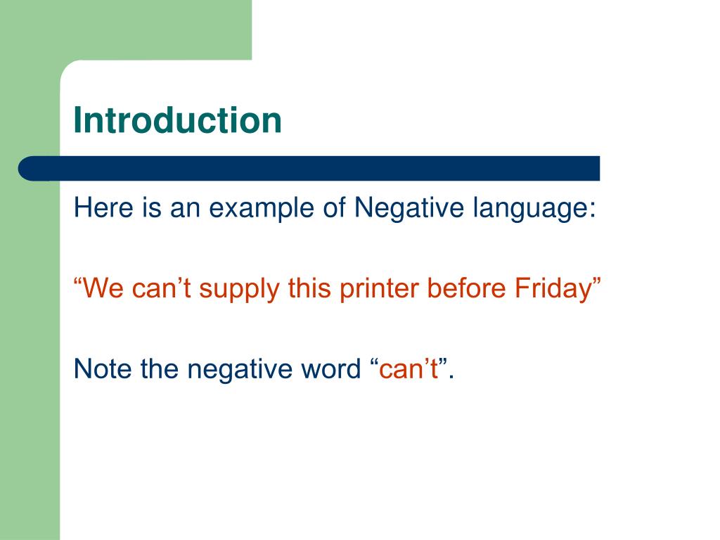 Introduction Here is an example of Negative language: “We can’t supply this printer before Friday” Note the negative word “can’t”.