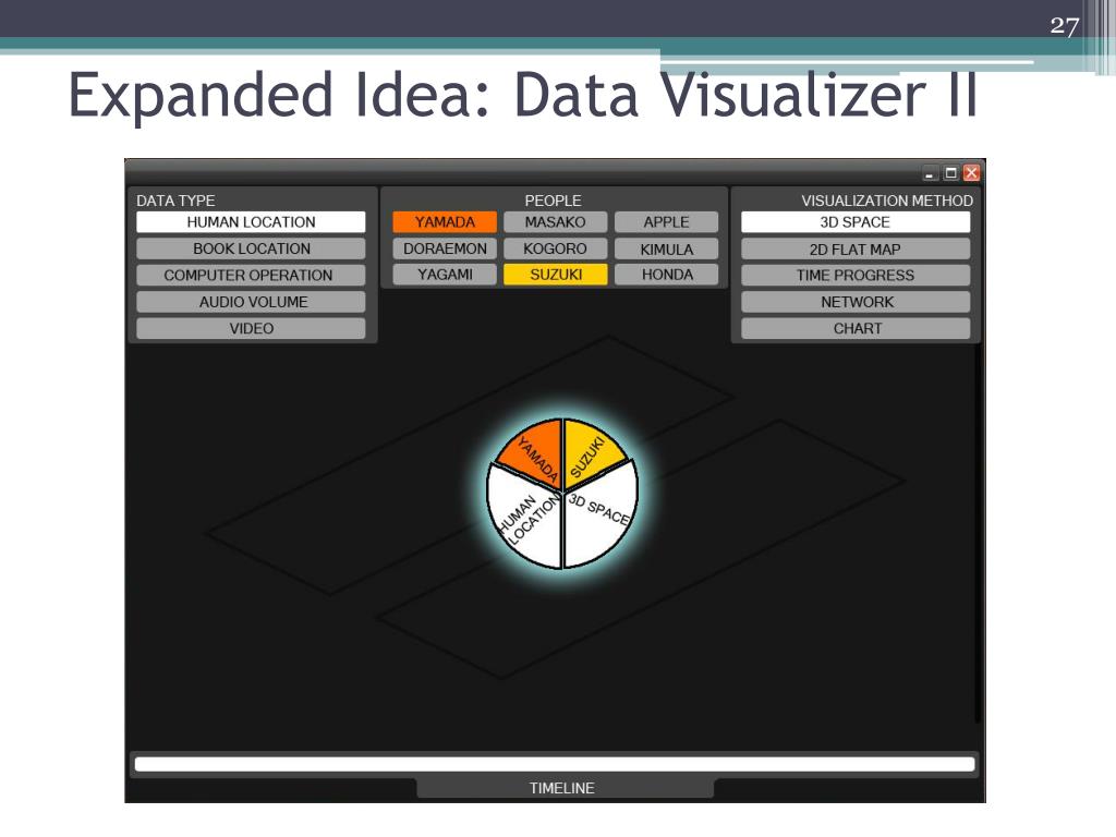 Data Visualizer I: Drawbacks • Unintuitive • Boringeven with enhanced theme/skin • Difficult to manage multiple data at once