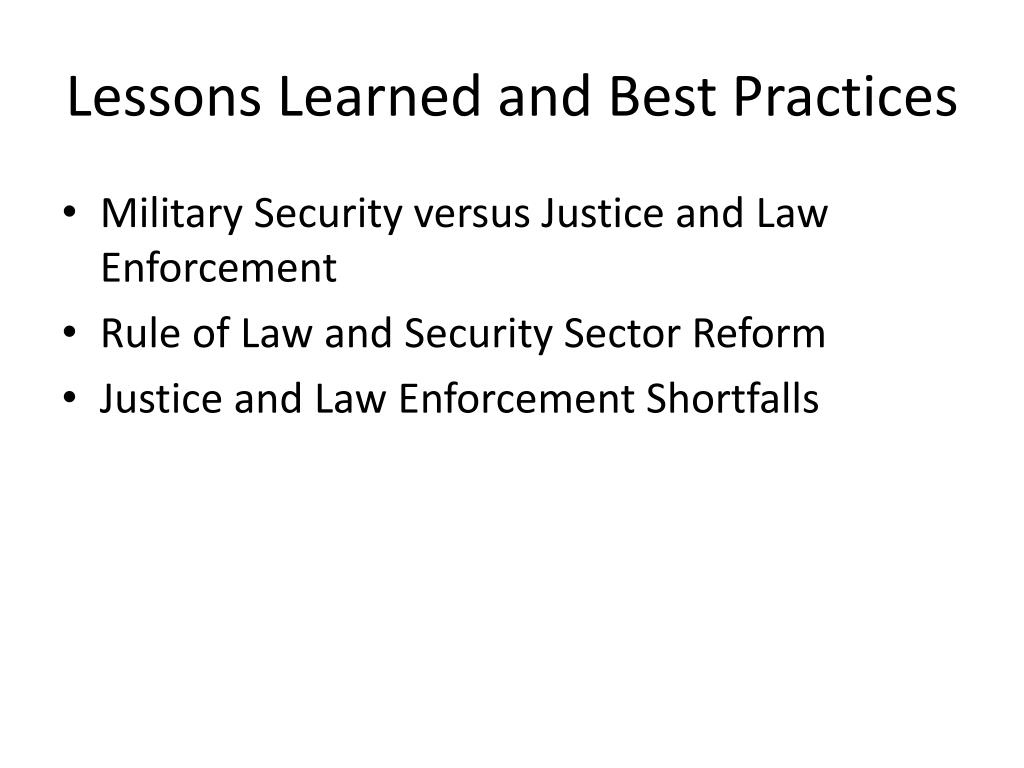 Lessons Learned and Best Practices • Military Security versus Justice and Law Enforcement • Rule of Law and Security Sector Reform • Justice and Law Enforcement Shortfalls