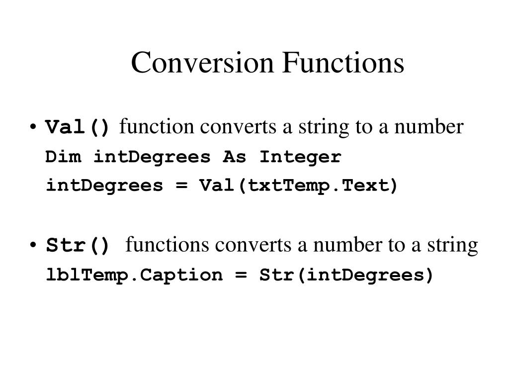 Conversion Functions • Val() function converts a string to a number • Dim intDegrees As Integer • intDegrees = Val(txtTemp.Text) • Str()functions converts a number to a string • lblTemp.Caption = Str(intDegrees)