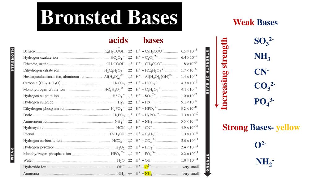 Bronsted Bases Weak Bases acids bases SO32- NH3 CN- Increasing strength CO32- PO43- Strong Bases- yellow O2- NH2-