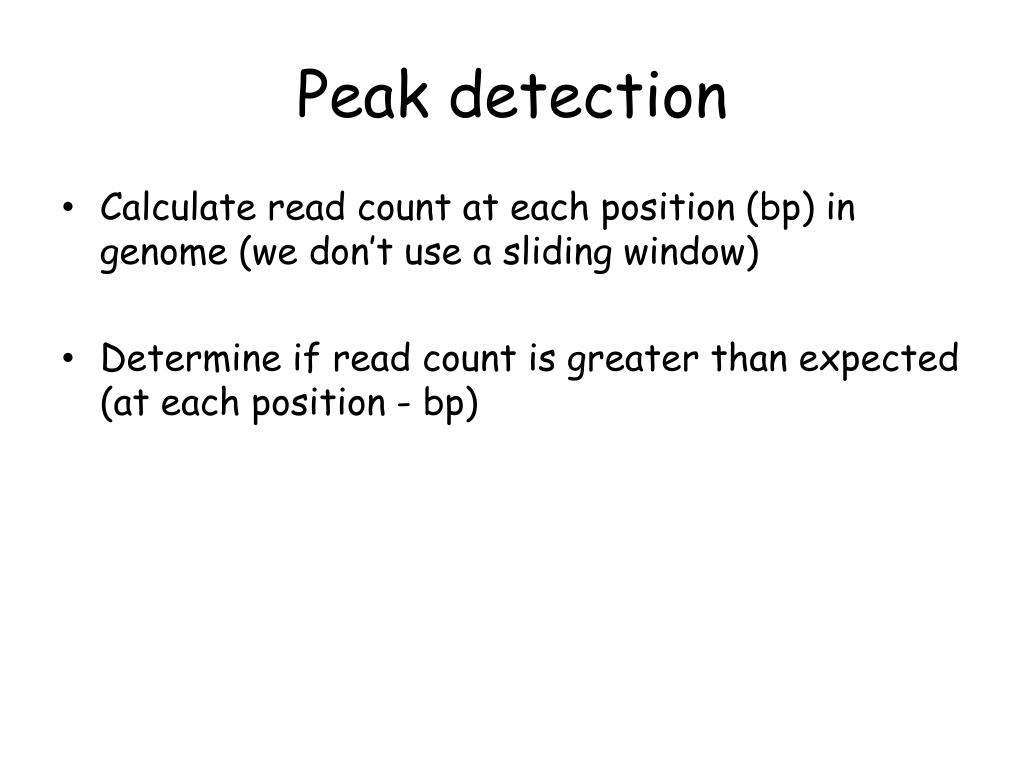 Peak detection • Calculate read count at each position (bp) in genome (we don’t use a sliding window) • Determine if read count is greater than expected (at each position - bp)