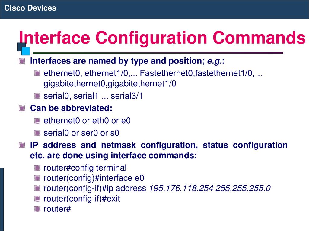 Cisco Devices Interface Configuration Commands • Interfaces are named by type and position; e.g.: • ethernet0, ethernet1/0,... Fastethernet0,fastethernet1/0,… gigabitethernet0,gigabitethernet1/0 • serial0, serial1 ... serial3/1 • Can be abbreviated: • ethernet0 or eth0 or e0 • serial0 or ser0 or s0 • IP address and netmask configuration, status configuration etc. are done using interface commands: • router#config terminal • router(config)#interface e0 • router(config-if)#ip address 195.176.118.254 255.255.255.0 • router(config-if)#exit • router#