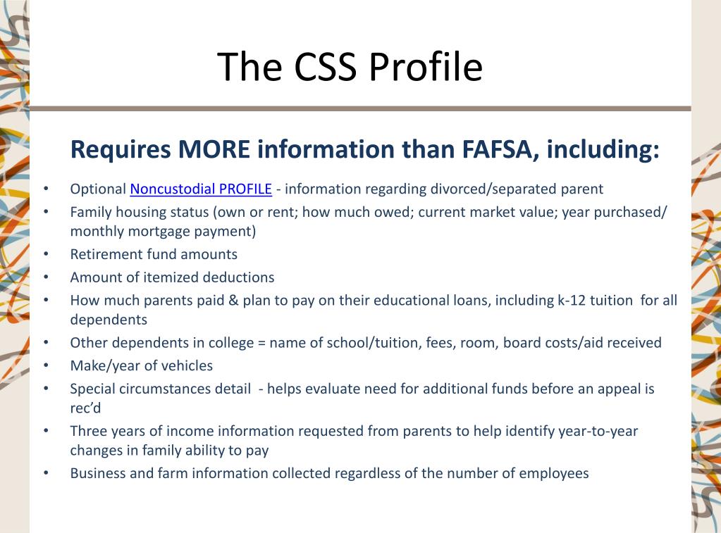The CSS Profile Requires MORE information than FAFSA, including: • Optional Noncustodial PROFILE - information regarding divorced/separated parent • Family housing status (own or rent; how much owed; current market value; year purchased/ monthly mortgage payment) • Retirement fund amounts • Amount of itemized deductions • How much parents paid & plan to pay on their educational loans, including k-12 tuition for all dependents • Other dependents in college = name of school/tuition, fees, room, board costs/aid received • Make/year of vehicles • Special circumstances detail - helps evaluate need for additional funds before an appeal is rec’d • Three years of income information requested from parentsto help identify year-to-year changes in family ability to pay • Business and farm information collected regardless of the number of employees