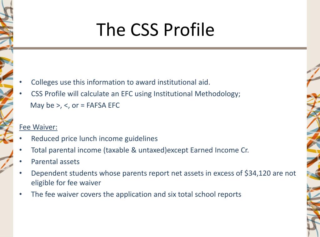 The CSS Profile • Colleges use this information to award institutional aid. • CSS Profile will calculate an EFC using Institutional Methodology; May be >, <, or = FAFSA EFC Fee Waiver: • Reduced price lunch income guidelines • Total parental income (taxable & untaxed)except Earned Income Cr. • Parental assets • Dependent students whose parents report net assets in excess of $34,120 are not eligible for fee waiver • The fee waiver covers the application and six total school reports