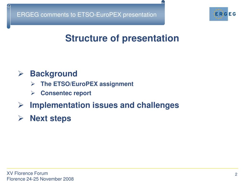 Structure of presentation • Background • The ETSO/EuroPEX assignment • Consentec report • Implementation issues and challenges • Next steps