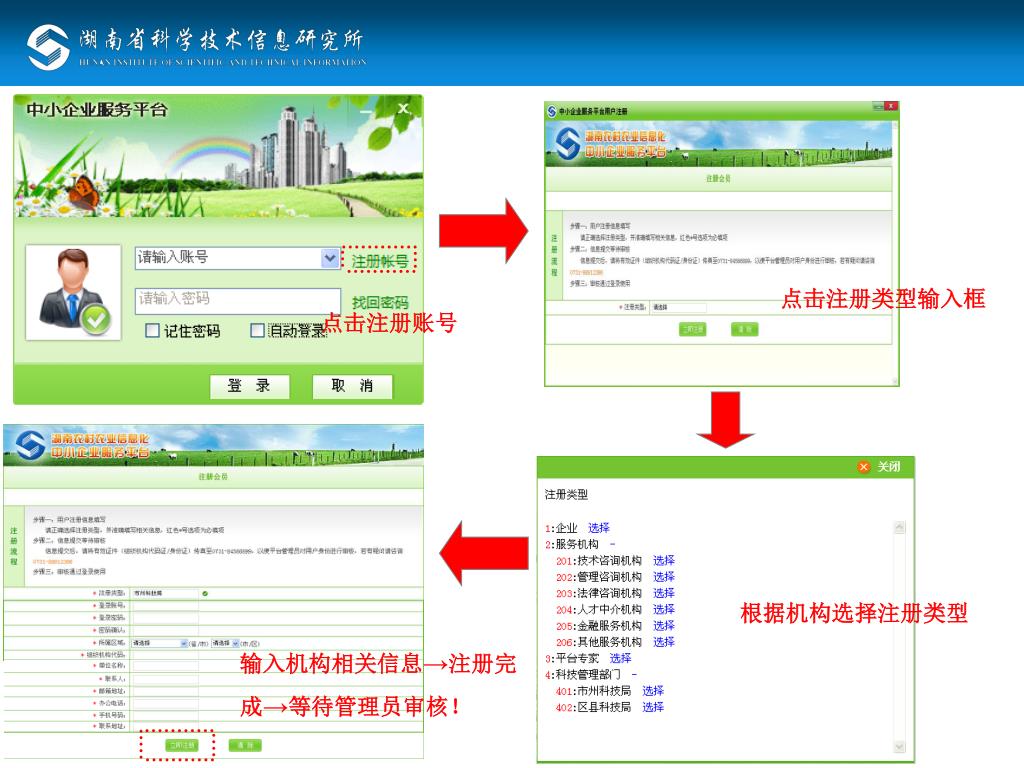 点击注册类型输入框 点击注册账号 根据机构选择注册类型 输入机构相关信息→注册完成→等待管理员审核!