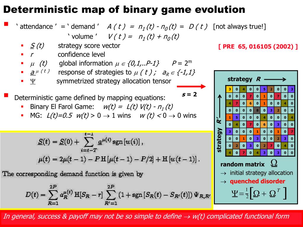 random matrix initial strategy allocation quenched disorder Deterministic map of binary game evolution [ PRE 65, 016105 (2002) ] • ‘ attendance ’ = ‘ demand ’ A( t )= n1 (t)- n0(t) = D ( t ) [not always true!] ‘ volume ’ V ( t ) = n1 (t)+ n0(t) • S (t) strategy score vector • r confidence level • m (t) global information m{0,1,..P-1} P = 2m • a m ( t) response of strategies to m ( t ) ; aR {-1,1} • Y symmetrized strategy allocation tensor • Deterministic game defined by mapping equations: • Binary El Farol Game: w(t) = L(t) V(t) - n1 (t) • MG: L(t)=0.5 w(t) > 0 1 wins w (t) < 0 0 wins strategy R s = 2 strategy R’ In general, success & payoff may not be so simple to define w(t) complicated functional form