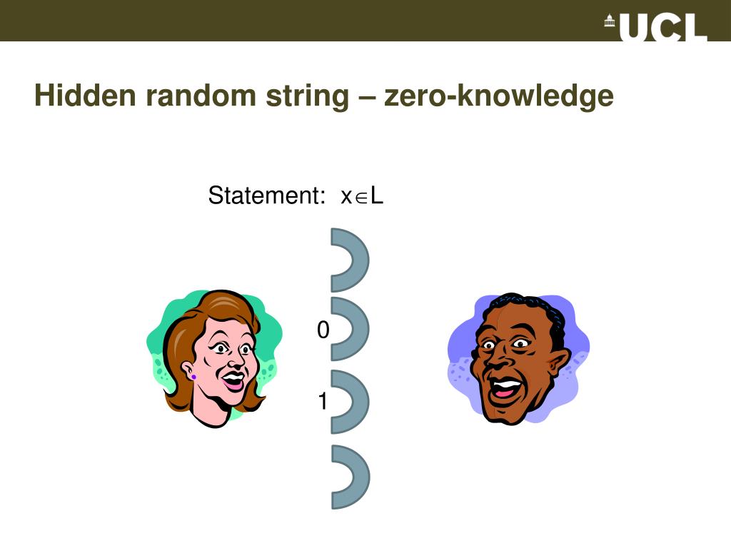 Hidden random string – zero-knowledge Statement: xL 0 1