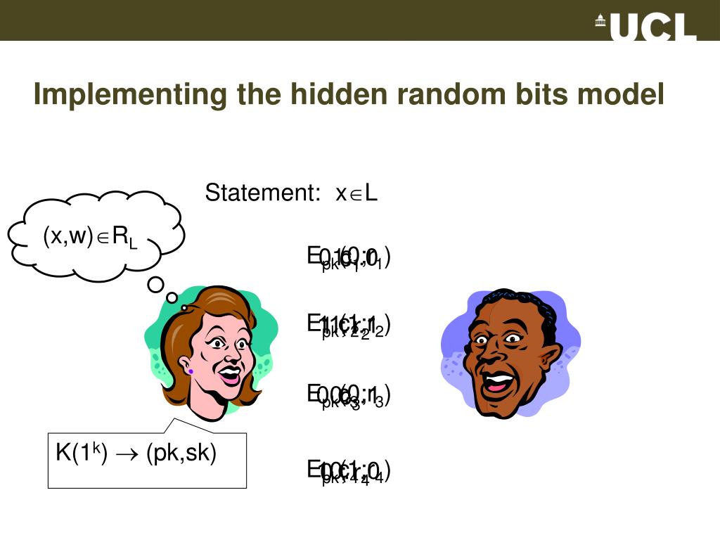 Implementing the hidden random bits model Statement: xL (x,w)RL Epk(0;r1) c1 01...0 c1 Epk(1;r2) c2 11…1 1 ; r2 Epk(0;r3) c3 00…1 c3 K(1k) (pk,sk) Epk(1;r4) c4 10…0 0 ; r4
