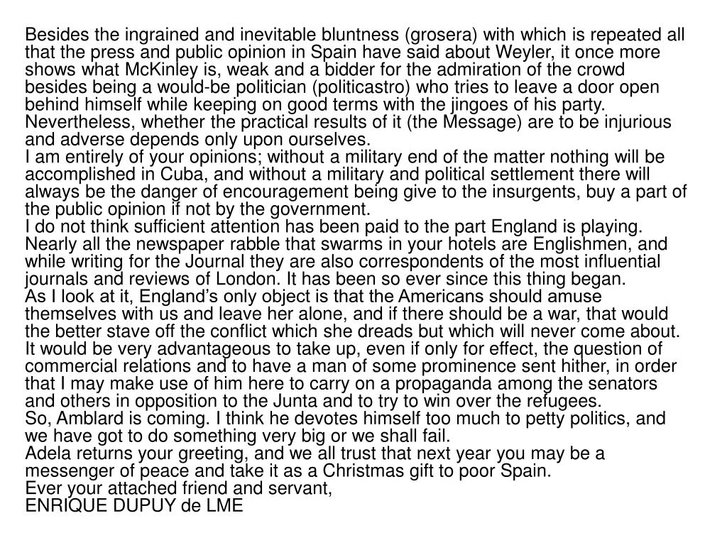 Besides the ingrained and inevitable bluntness (grosera) with which is repeated all that the press and public opinion in Spain have said about Weyler, it once more shows what McKinley is, weak and a bidder for the admiration of the crowd besides being a would-be politician (politicastro) who tries to leave a door open behind himself while keeping on good terms with the jingoes of his party.Nevertheless, whether the practical results of it (the Message) are to be injurious and adverse depends only upon ourselves.I am entirely of your opinions; without a military end of the matter nothing will be accomplished in Cuba, and without a military and political settlement there will always be the danger of encouragement being give to the insurgents, buy a part of the public opinion if not by the government.I do not think sufficient attention has been paid to the part England is playing.Nearly all the newspaper rabble that swarms in your hotels are Englishmen, and while writing for the Journal they are also correspondents of the most influential journals and reviews of London. It has been so ever since this thing began.As I look at it, England’s only object is that the Americans should amuse themselves with us and leave her alone, and if there should be a war, that would the better stave off the conflict which she dreads but which will never come about.It would be very advantageous to take up, even if only for effect, the question of commercial relations and to have a man of some prominence sent hither, in order that I may make use of him here to carry on a propaganda among the senators and others in opposition to the Junta and to try to win over the refugees.So, Amblard is coming. I think he devotes himself too much to petty politics, and we have got to do something very big or we shall fail.Adela returns your greeting, and we all trust that next year you may be a messenger of peace and take it as a Christmas gift to poor Spain.Ever your attached friend and servant,ENRIQUE DUPUY de LME