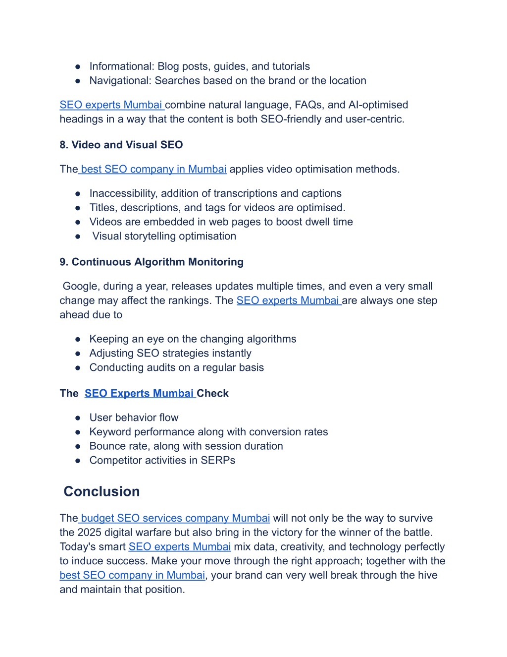 4. ● Informational: Blog posts, guides, and tutorials ● Navigational: Searches based on the brand or the location SEO experts Mumbai combine natural language, FAQs, and AI-optimised headings in a way that the content is both SEO-friendly and user-centric. 8. Video and Visual SEO The best SEO company in Mumbai applies video optimisation methods. ● Inaccessibility, addition of transcriptions and captions ● Titles, descriptions, and tags for videos are optimised. ● Videos are embedded in web pages to boost dwell time ● Visual storytelling optimisation 9. Continuous Algorithm Monitoring Google, during a year, releases updates multiple times, and even a very small change may affect the rankings. The SEO experts Mumbai are always one step ahead due to ● Keeping an eye on the changing algorithms ● Adjusting SEO strategies instantly ● Conducting audits on a regular basis The SEO Experts Mumbai Check ● User behavior flow ● Keyword performance along with conversion rates ● Bounce rate, along with session duration ● Competitor activities in SERPs Conclusion The budget SEO services company Mumbaiwill not only be the way to survive the 2025 digital warfare but also bring in the victory for the winner of the battle. Today's smart SEO experts Mumbai mix data, creativity, and technology perfectly to induce success. Make your move through the right approach; together with the best SEO company in Mumbai, your brand can very well break through the hive and maintain that position.