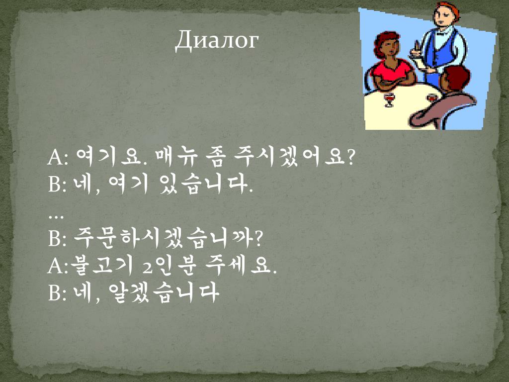 Диалог A: 여기요. 매뉴 좀 주시겠어요? B: 네, 여기 있습니다. ... B: 주문하시겠습니까? A:불고기 2인분 주세요. B: 네, 알겠습니다