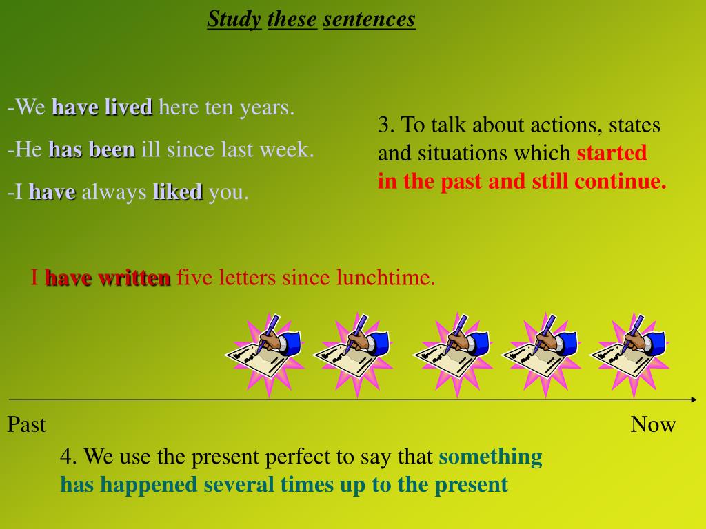 Studythesesentences -We have lived here ten years. -He has been ill since last week. -I have always liked you. 3. To talk about actions, states and situations which started in the past and still continue. I have written five letters since lunchtime. Past Now 4. We use the present perfect to say that something has happened several times up to the present