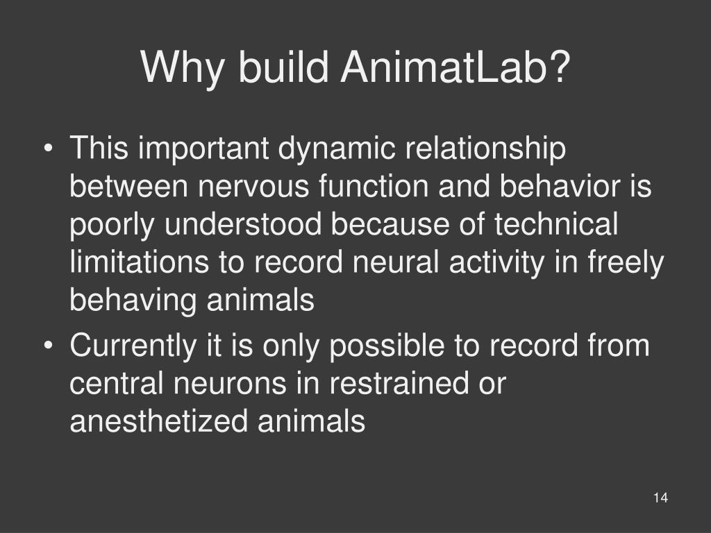 Why build AnimatLab? • This important dynamic relationship between nervous function and behavior is poorly understood because of technical limitations to record neural activity in freely behaving animals • Currently it is only possible to record from central neurons in restrained or anesthetized animals