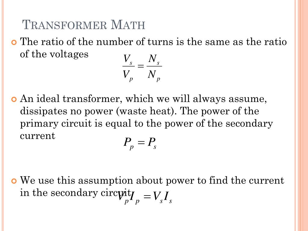 Transformer Math • The ratio of the number of turns is the same as the ratio of the voltages • An ideal transformer, which we will always assume, dissipates no power (waste heat). The power of the primary circuit is equal to the power of the secondary current • We use this assumption about power to find the current in the secondary circuit