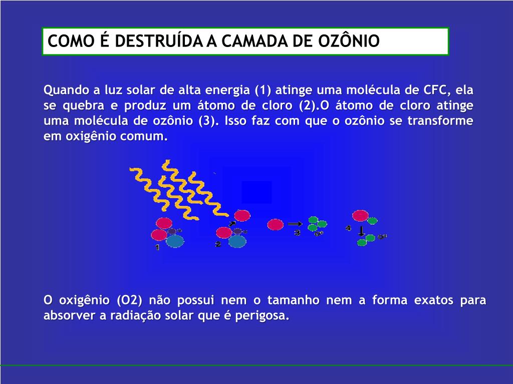 COMO É DESTRUÍDA A CAMADA DE OZÔNIO Quando a luz solar de alta energia (1) atinge uma molécula de CFC, ela se quebra e produz um átomo de cloro (2).O átomo de cloro atinge uma molécula de ozônio (3). Isso faz com que o ozônio se transforme em oxigênio comum. O oxigênio (O2) não possui nem o tamanho nem a forma exatos para absorver a radiação solar que é perigosa.