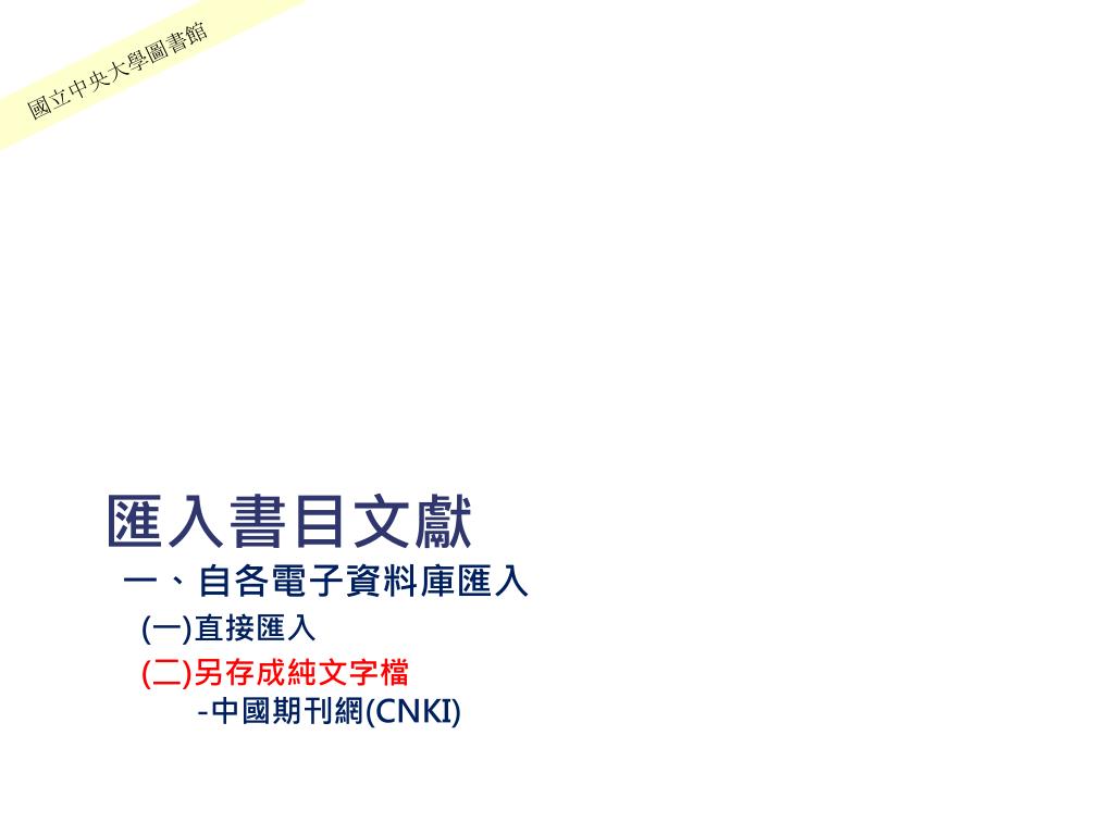 國立中央大學圖書館 匯入書目文獻 一、自各電子資料庫匯入(一)直接匯入(二)另存成純文字檔-中國期刊網(CNKI)