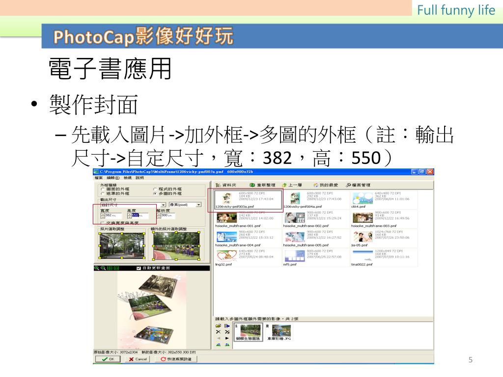 Full funny life 製作封面 先載入圖片->加外框->多圖的外框(註:輸出尺寸->自定尺寸,寬:382,高:550) PhotoCap影像好好玩 電子書應用