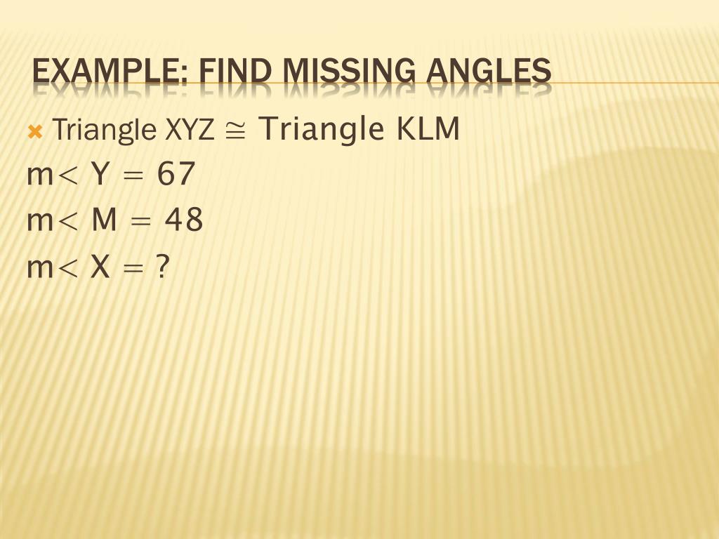 Triangle XYZ ≅ Triangle KLM m< Y = 67 m< M = 48 m< X = ? Example: Find missing angles