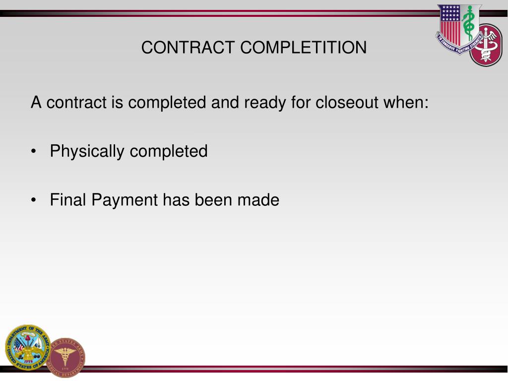 CONTRACT COMPLETITION A contract is completed and ready for closeout when: • Physically completed • Final Payment has been made