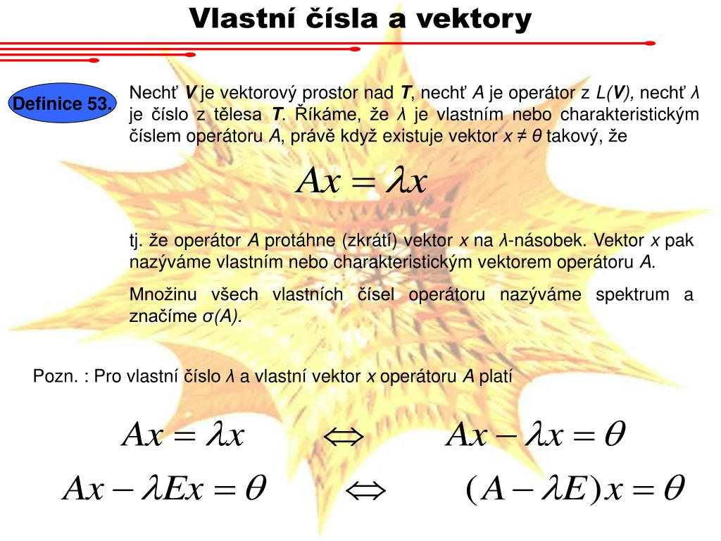 Vlastní čísla a vektory Definice 53. Nechť V je vektorový prostor nad T, nechť A je operátor z L(V), nechť λ je číslo z tělesa T. Říkáme, že λ je vlastním nebo charakteristickým číslem operátoru A, právě když existuje vektor x ≠ θ takový, že tj. že operátor A protáhne (zkrátí) vektor x na λ-násobek. Vektor x pak nazýváme vlastním nebo charakteristickým vektorem operátoru A. Množinu všech vlastních čísel operátoru nazýváme spektrum a značíme σ(A). Pozn. : Pro vlastní číslo λ a vlastní vektor x operátoru A platí
