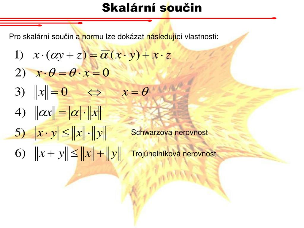 Skalární součin Pro skalární součin a normu lze dokázat následující vlastnosti: Schwarzova nerovnost Trojúhelníková nerovnost