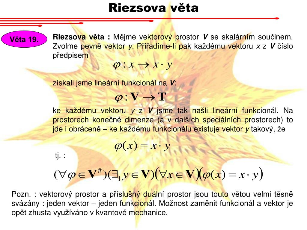Riezsova věta Věta 19. Riezsova věta : Mějme vektorový prostor V se skalárním součinem. Zvolme pevně vektor y. Přiřadíme-li pak každému vektoru x z V číslo předpisem získali jsme lineární funkcionál na V: ke každému vektoru y z V jsme tak našli lineární funkcionál. Na prostorech konečné dimenze (a v dalších speciálních prostorech) to jde i obráceně – ke každému funkcionálu existuje vektor y takový, že tj. : Pozn. : vektorový prostor a příslušný duální prostor jsou touto větou velmi těsně svázány : jeden vektor – jeden funkcionál. Možnost zaměnit funkcionál a vektor je opět zhusta využíváno v kvantové mechanice.