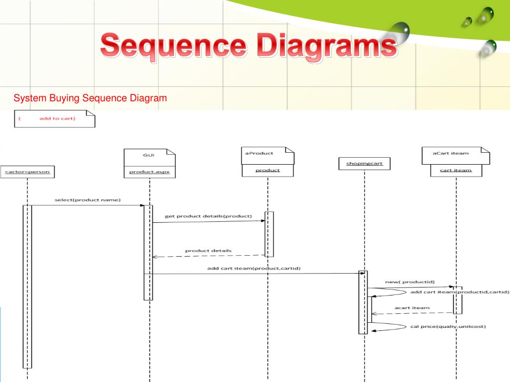 Use case Details • Checkout: Purpose: To allow user to buy the products added to the shopping cart. Precondition: User must be logged in and must have atleast one item in shopping Cart to be able to checkout and place the order. Input: When the customer finishes shopping, he requests to checkout by clicking “checkout” button on Cart.aspx page. Output: If the payment information of this customer already exists, the system prompts the customer to review or input a new one. If the credit card is valid, the order form will be processed by the system and checkout is complete.