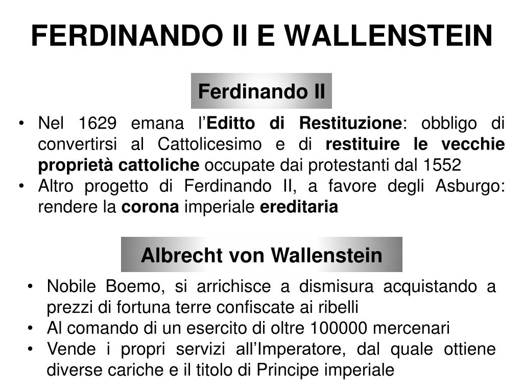 FERDINANDO II E WALLENSTEIN Ferdinando II • Nel 1629 emana l’Editto di Restituzione: obbligo di convertirsi al Cattolicesimo e di restituire le vecchie proprietà cattoliche occupate dai protestanti dal 1552 • Altro progetto di Ferdinando II, a favore degli Asburgo: rendere la corona imperiale ereditaria Albrecht von Wallenstein • Nobile Boemo, si arrichisce a dismisura acquistando a prezzi di fortuna terre confiscate ai ribelli • Al comando di un esercito di oltre 100000 mercenari • Vende i propri servizi all’Imperatore, dal quale ottiene diverse cariche e il titolo di Principe imperiale
