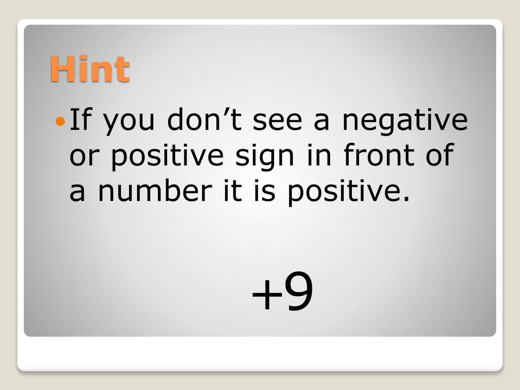 If you don’t see a negative or positive sign in front of a number it is positive. 9 + Hint