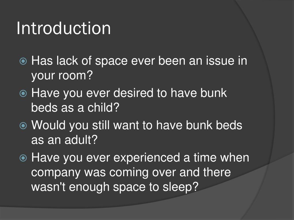 Introduction • Has lack of space ever been an issue in your room? • Have you ever desired to have bunk beds as a child? • Would you still want to have bunk beds as an adult? • Have you ever experienced a time when company was coming over and there wasn't enough space to sleep?