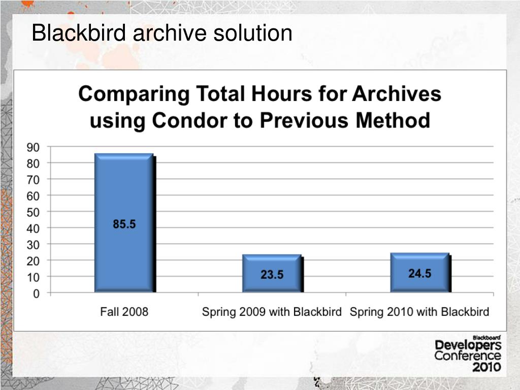 Blackbird Benefits • Reduced total archive time from > 85 hrs to < 24 hrs • Job scheduling – servers finish about the same time • Zero impact to Blackboard Performance • Automatic suspension/resumption of archives if Load reaches threshold on any core • Email notification upon completion of all archives • Load balancing – archive jobs are distributed as cores become available • Takes advantage of all available CPU cores instead of just one core per server