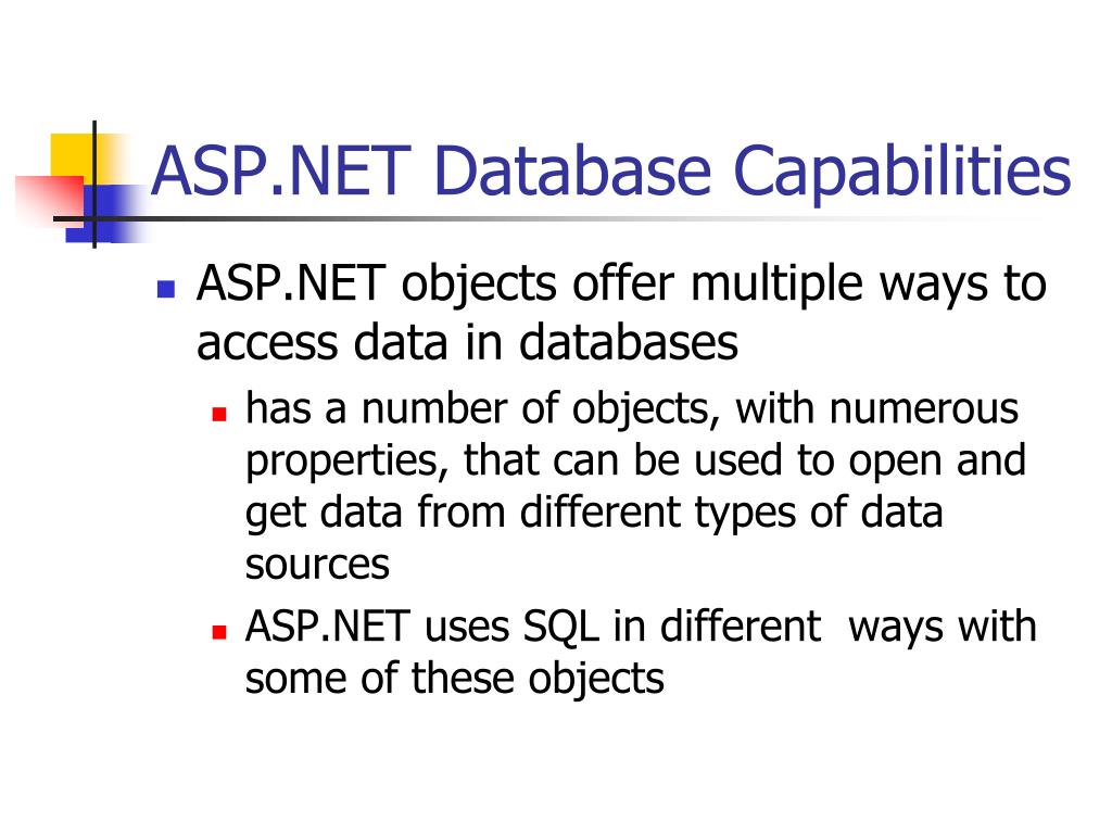 ASP.NET Database Capabilities • ASP.NET objects offer multiple ways to access data in databases • has a number of objects, with numerous properties, that can be used to open and get data from different types of data sources • ASP.NET uses SQL in different ways with some of these objects