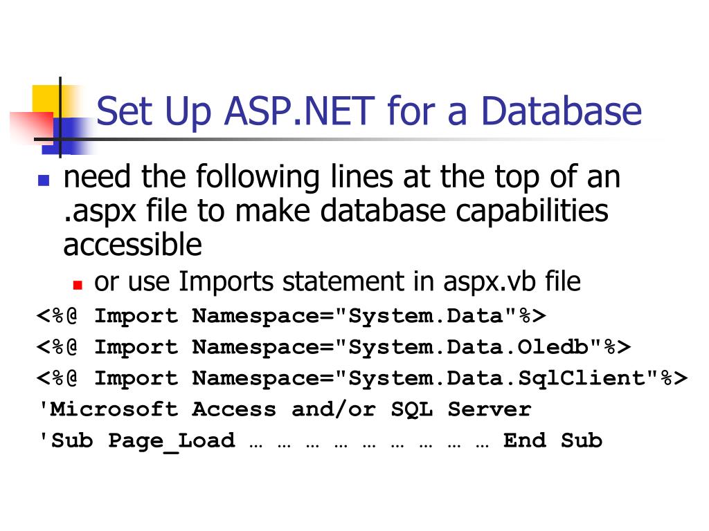 Set Up ASP.NET for a Database • need the following lines at the top of an .aspx file to make database capabilities accessible • or use Imports statement in aspx.vb file <%@ Import Namespace="System.Data"%> <%@ Import Namespace="System.Data.Oledb"%> <%@ Import Namespace="System.Data.SqlClient"%> 'Microsoft Access and/or SQL Server 'Sub Page_Load … … … … … … … … … End Sub