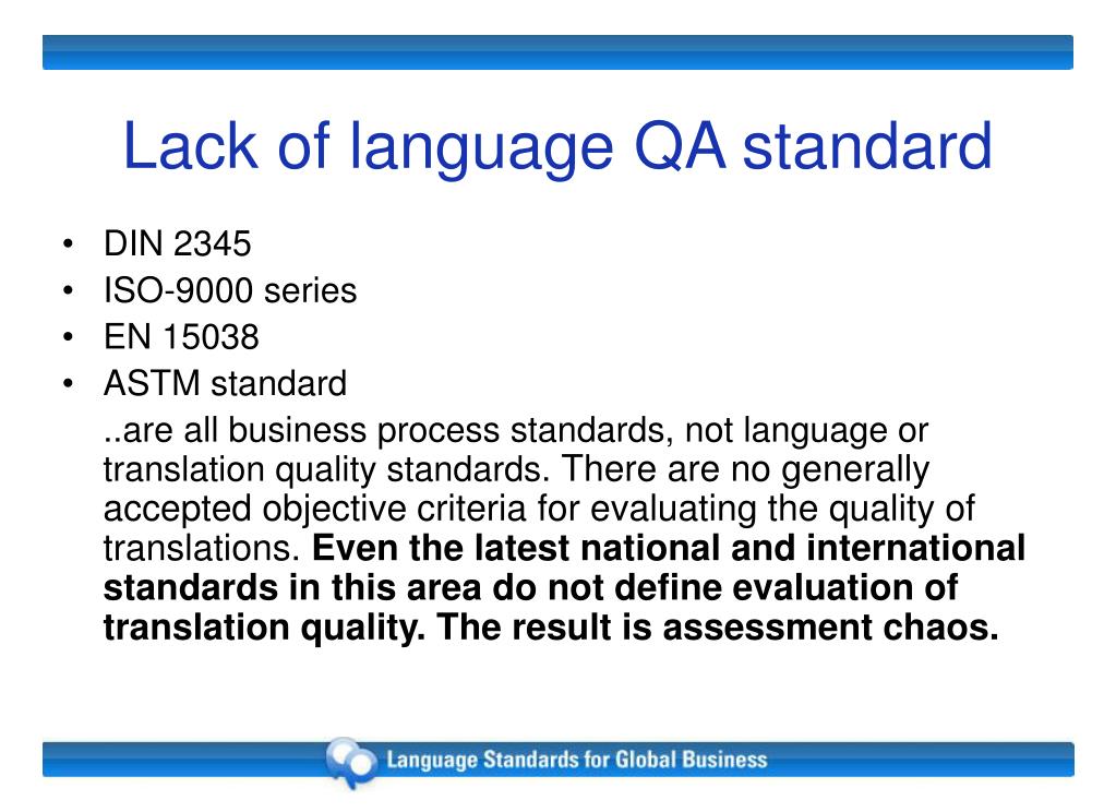 Lack of language QA standard • DIN 2345 • ISO-9000 series • EN 15038 • ASTM standard ..are all business process standards, not language or translation quality standards. There are no generally accepted objective criteria for evaluating the quality of translations. Even the latest national and international standards in this area do not define evaluation of translation quality. The result is assessment chaos.