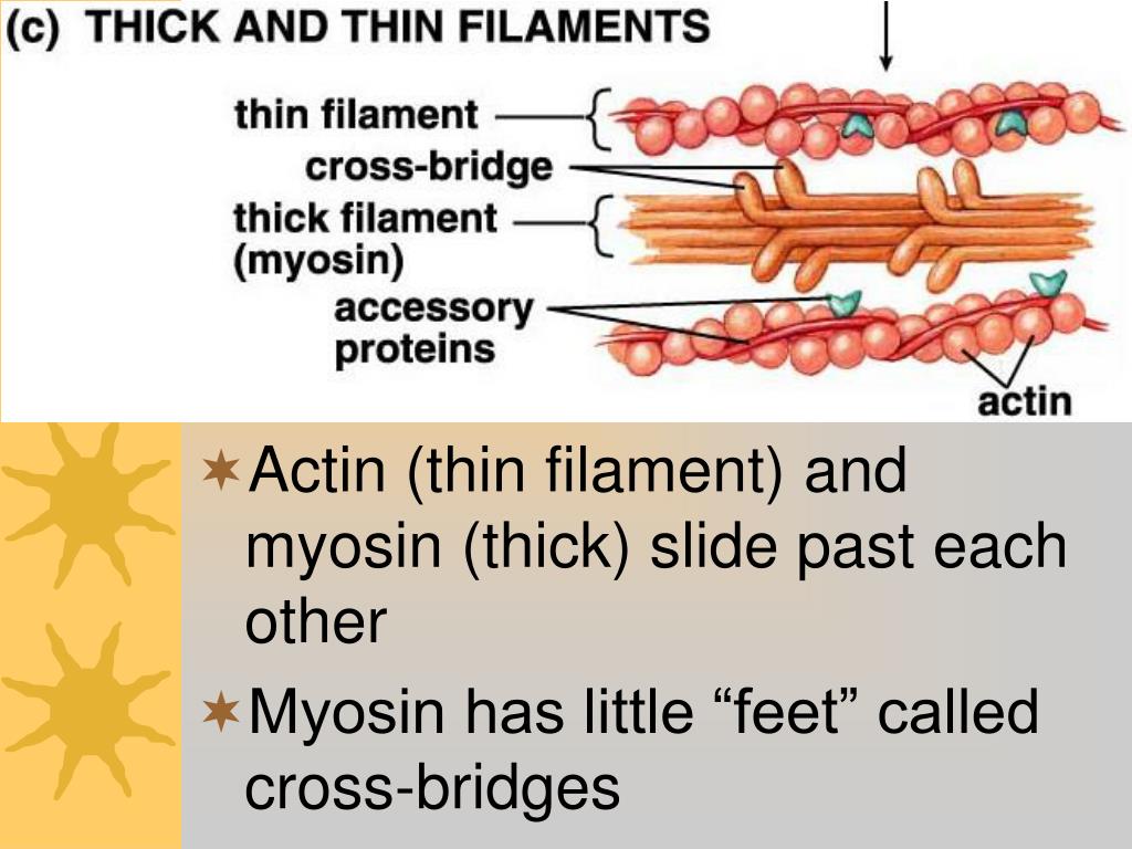Actin (thin filament) and myosin (thick) slide past each other • Myosin has little “feet” called cross-bridges