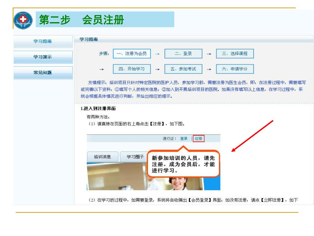 第三步 等待医院管理员审核通过 • 个人注册会员成功后需等待医院管理员审核通过,只有在医院管理员审核通过后你才可以进入学习考试。(医院管理员会在每日上午审核全院注册会员)