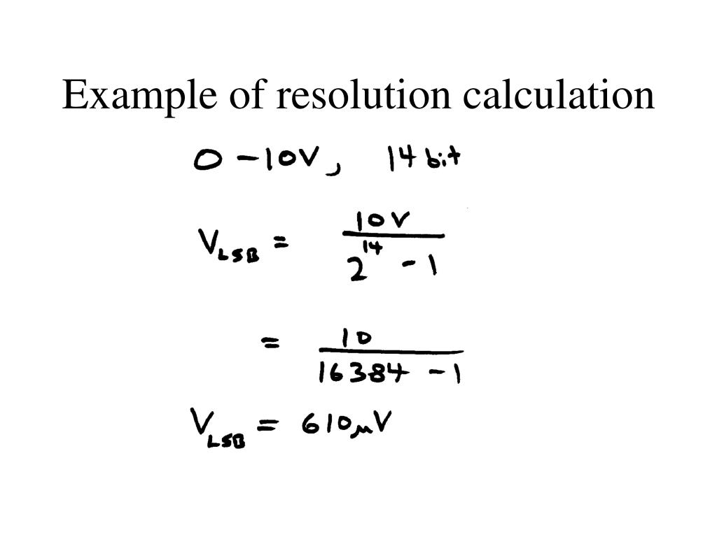 Calculating resolution Resolution = Full scale value / 2N -1 N is the number of bits on the converter Example, for a 0-10V, 12 bit system. The resolution is 10/4096-1 = 2.44mV