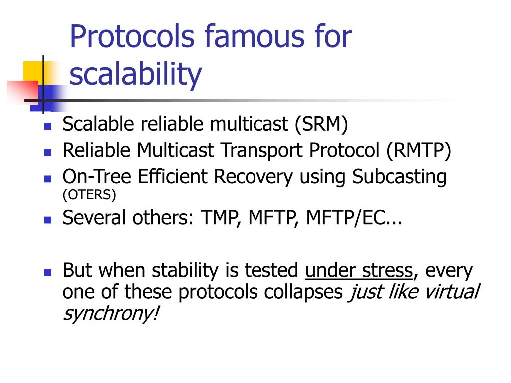 Protocols famous for scalability • Scalable reliable multicast (SRM) • Reliable Multicast Transport Protocol (RMTP) • On-Tree Efficient Recovery using Subcasting (OTERS) • Several others: TMP, MFTP, MFTP/EC... • But when stability is tested under stress, every one of these protocols collapses just like virtual synchrony!