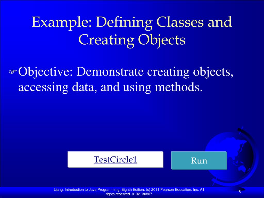 Example: Defining Classes and Creating Objects • Objective: Demonstrate creating objects, accessing data, and using methods. TestCircle1 Run