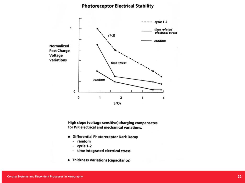 P/R Charging Problem Statement 2. An AC scorotron will be utilized to charge the same ideal photoreceptor to within 98% of its –800 volt grid potential at the same P/R surface velocity (10 ips.=0.254 m./sec.). The static I-V characteristics show that the intercept voltage is approximately equal to the grid bias as expected. The initial residual photoreceptor potential entering the charge device is 0. What must the voltage sensitivity (slope) of the device be to achieve this function? 29