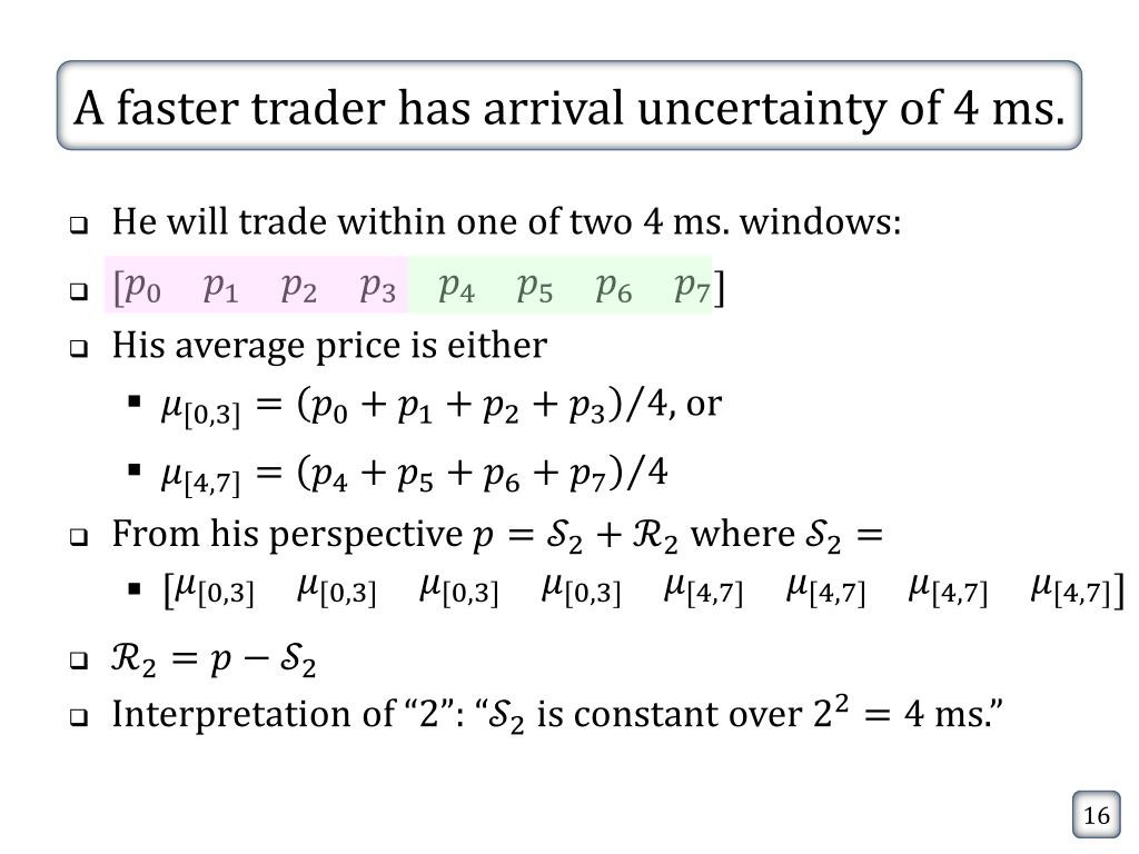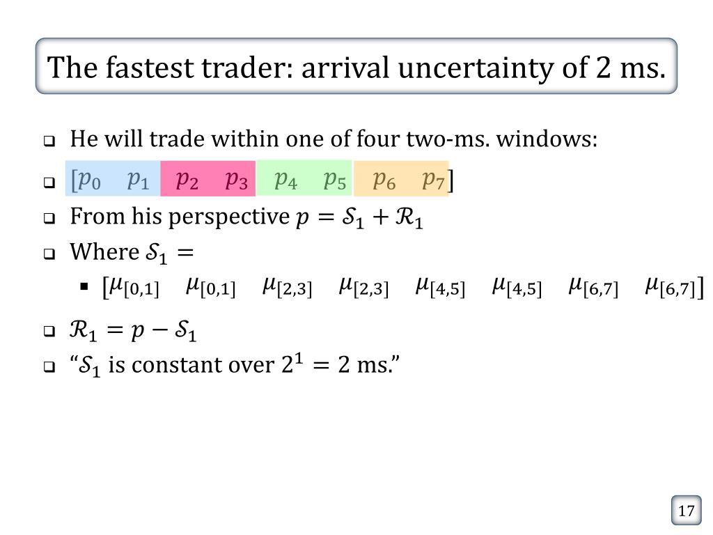 The fastest trader: arrival uncertainty of 2 ms. • He will trade within one of four two-ms. windows: • From his perspective • Where • “ is constant over ms.”