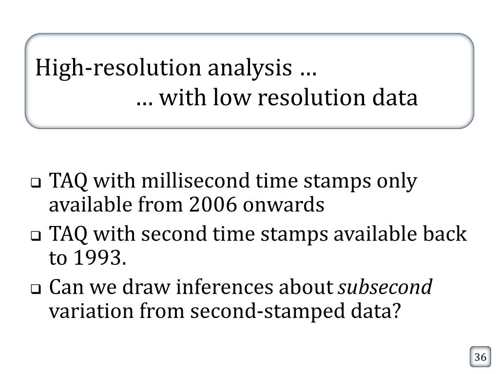 High-resolution analysis … … with low resolution data • TAQ with millisecond time stamps only available from 2006 onwards • TAQ with second time stamps available back to 1993. • Can we draw inferences about subsecond variation from second-stamped data?