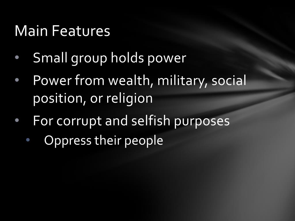 Main Features • Small group holds power • Power from wealth, military, social position, or religion • For corrupt and selfish purposes • Oppress their people