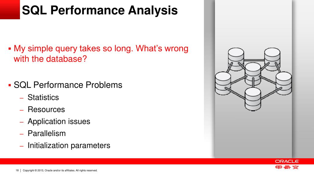 My simple query takes so long. What’s wrong with the database? SQL Performance Problems Statistics Resources Application issues Parallelism Initialization parameters SQL Performance Analysis