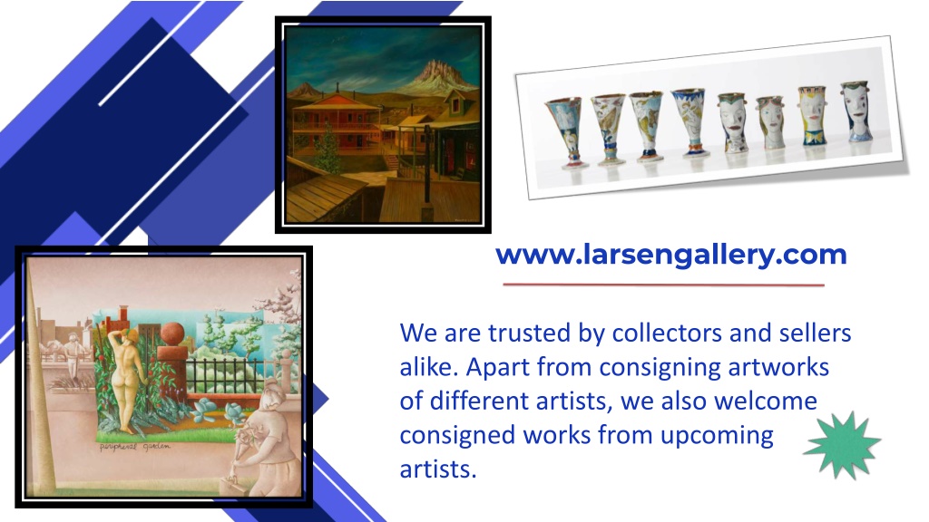 3. www.larsengallery.com We are trusted by collectors and sellers alike. Apart from consigning artworks of different artists, we also welcome consigned works from upcoming artists.