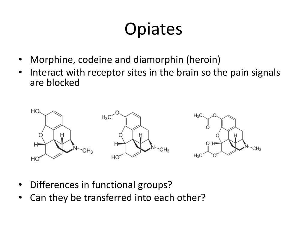 Opiates • Morphine, codeine and diamorphin (heroin) • Interactwith receptor sites in the brain so the pain signals areblocked • Differences in functionalgroups? • Canthey be transferredintoeachother?