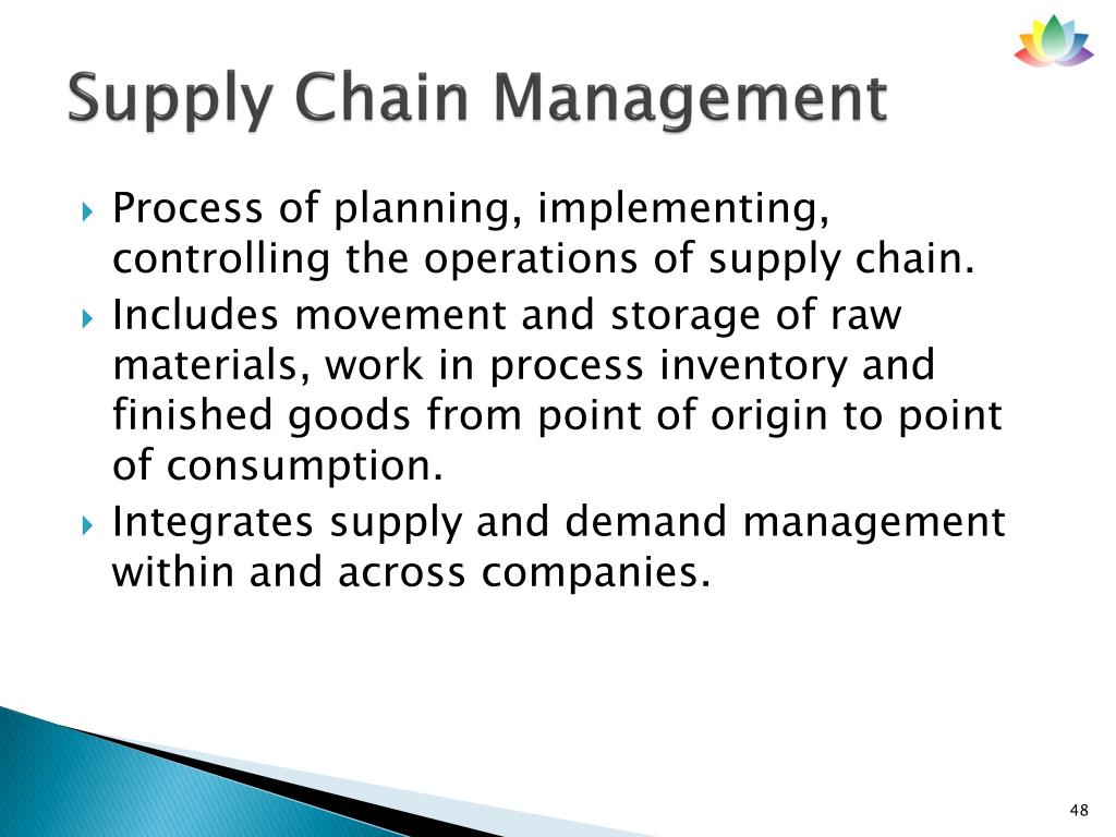 Supply Chain Management • Process of planning, implementing, controlling the operations of supply chain. • Includes movement and storage of raw materials, work in process inventory and finished goods from point of origin to point of consumption. • Integrates supply and demand management within and across companies.